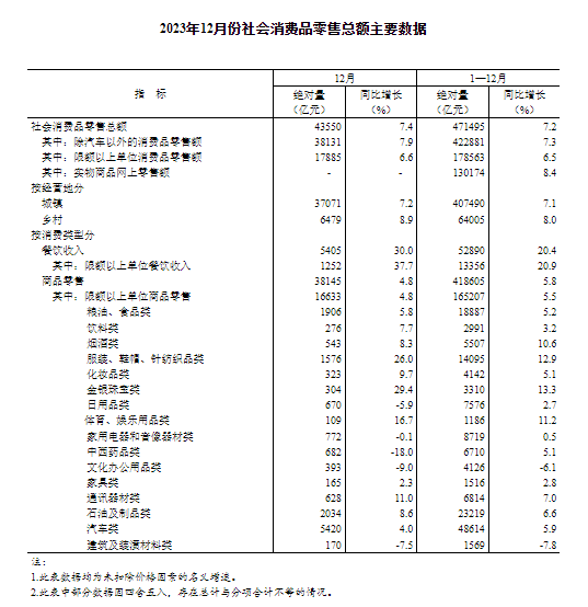 聯(lián)商快訊:1月17日,國家統(tǒng)計局數(shù)據(jù)顯示,2023年12月份,社會消費品零售總額43550億元,同比增長7.4%。其中,除汽車以外的消費品零售額38131億元,增長7.9%。