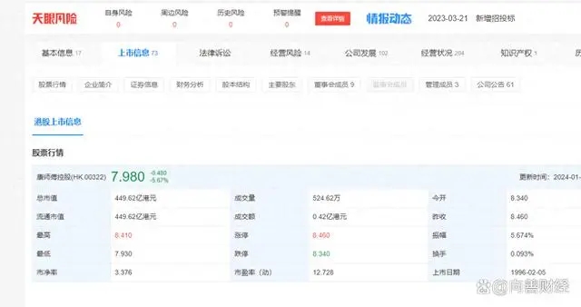 從2022年的315開始,康師傅就被中斷了股價上升趨勢,并開啟了跌跌不休之路。直到2024年的1月15日收盤,天眼查APP顯示,康師傅已跌落至8.46元/股,股價創(chuàng)2020年以來的歷史新低……