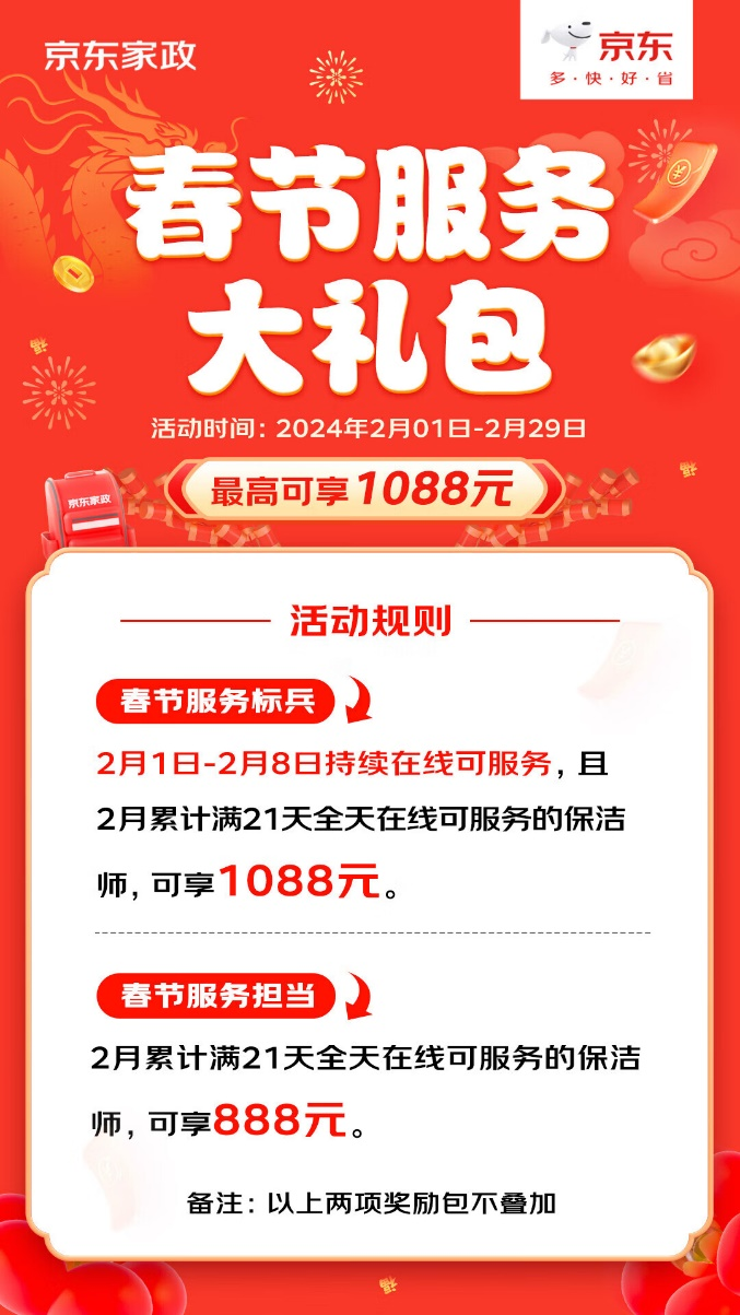 隨著京東年貨節(jié)的火熱開啟,為獎(jiǎng)勵(lì)在春節(jié)期間為消費(fèi)者提供服務(wù)的家政保潔師、提高他們?cè)诘氖杖,京東將發(fā)放春節(jié)服務(wù)大禮包。凡是2月1日-8日持續(xù)為消費(fèi)者提供保潔服務(wù),且2月累計(jì)服務(wù)滿21天的保潔師,可享1088元的春節(jié)服務(wù)標(biāo)兵大禮包;凡是2月累計(jì)服務(wù)滿21天的保潔師可享888元的春節(jié)服務(wù)擔(dān)當(dāng)大禮包。