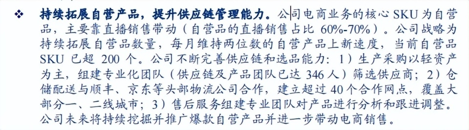 東方甄選正致力于加強(qiáng)供應(yīng)鏈管理體系,擴(kuò)大產(chǎn)品類別,增加產(chǎn)品數(shù)量和SKU,尤其是自營產(chǎn)品。根據(jù)去年12月華創(chuàng)證券發(fā)布的研報顯示,東方甄選自營品的SKU數(shù)量已超200個,直播銷售占比約60-70%。