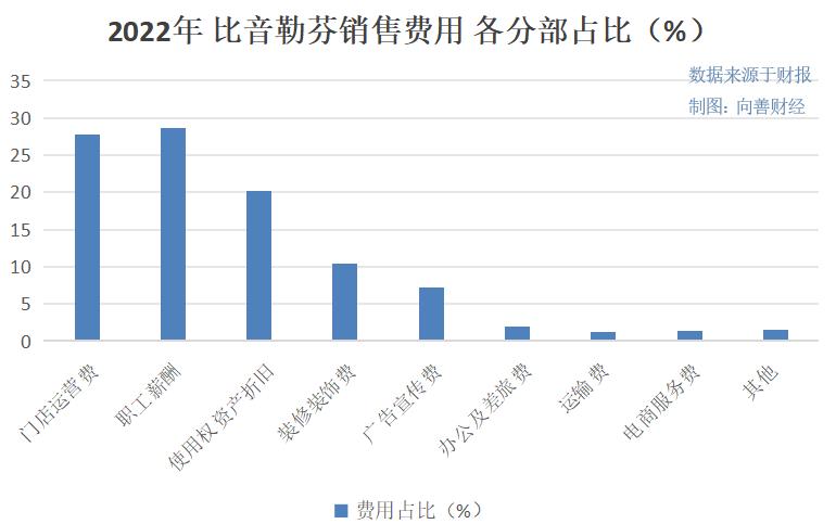 具體到銷售費(fèi)用方面,近三年間,比音勒芬的銷售費(fèi)用分別為8.85億元、10.41億元和10.36億元,對(duì)應(yīng)的銷售費(fèi)用率為38.45%、38.27%和35.91%。乍一看似乎還不錯(cuò),但是深入其中你會(huì)發(fā)現(xiàn),在銷售費(fèi)用構(gòu)成中占大頭的是職工薪酬、門店運(yùn)營(yíng)費(fèi) 裝修裝飾費(fèi)和使用權(quán)資產(chǎn)折舊等等,其次才是廣告宣傳費(fèi)。