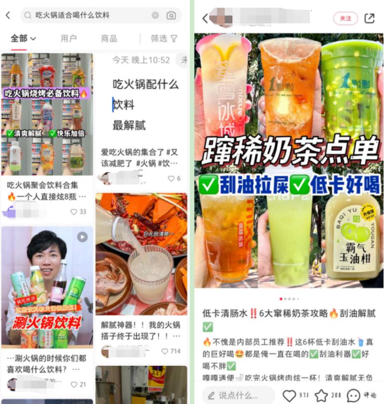 好比小紅書內(nèi),搜索吃火鍋適合什么飲品,出現(xiàn)的關(guān)鍵詞一般是解油解膩、好喝不胖、低卡、維C豐富等,其中無糖碳酸飲料、茶飲料、無糖咖啡等飲料推薦內(nèi)容居多,高糖的碳酸飲料推薦內(nèi)容偏少。
