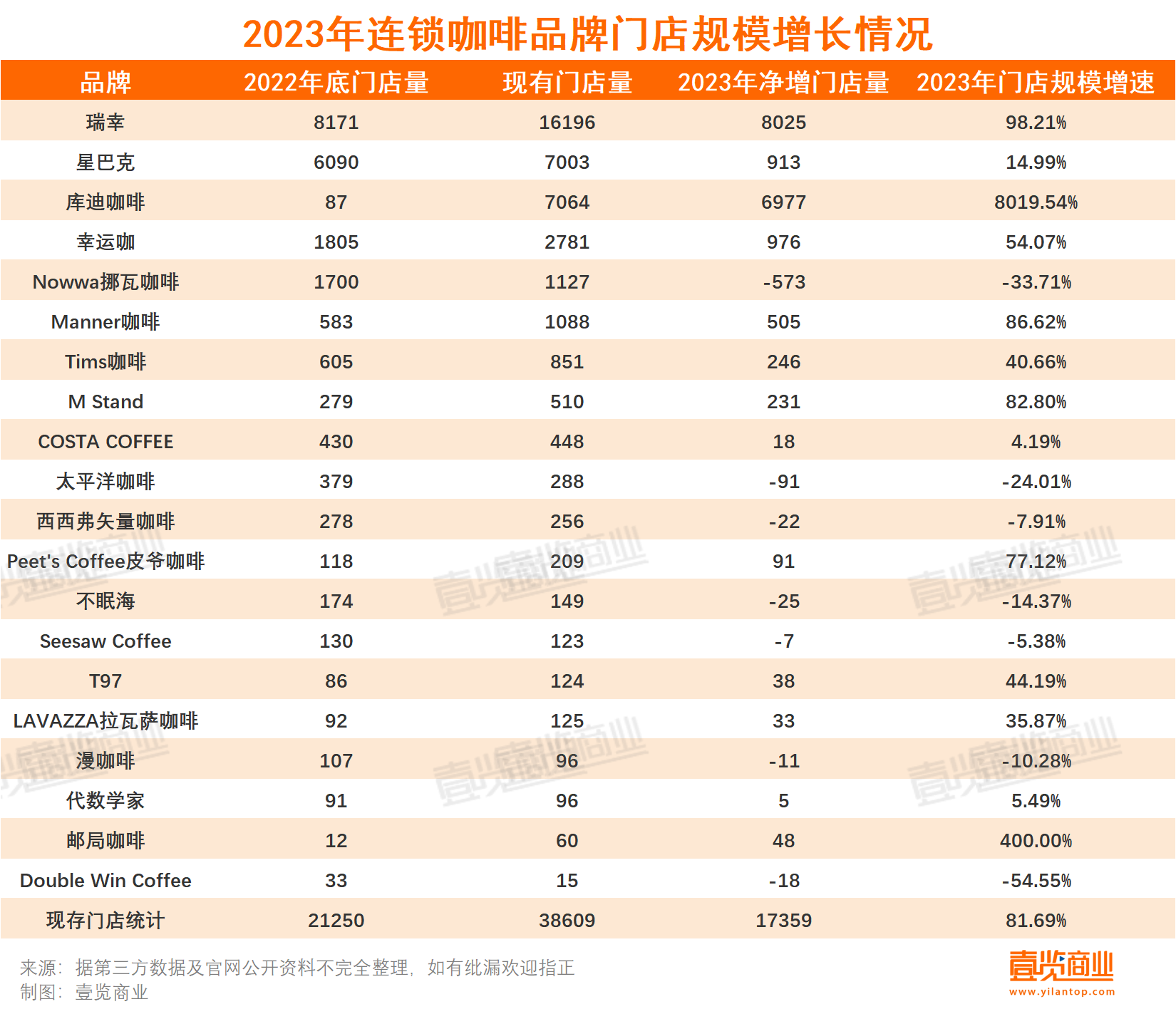 從門店總量來看,壹覽商業(yè)長期跟蹤的20家連鎖咖啡品牌以81.69%的增速從2022年底的21250家門店擴(kuò)張至38609家門店。