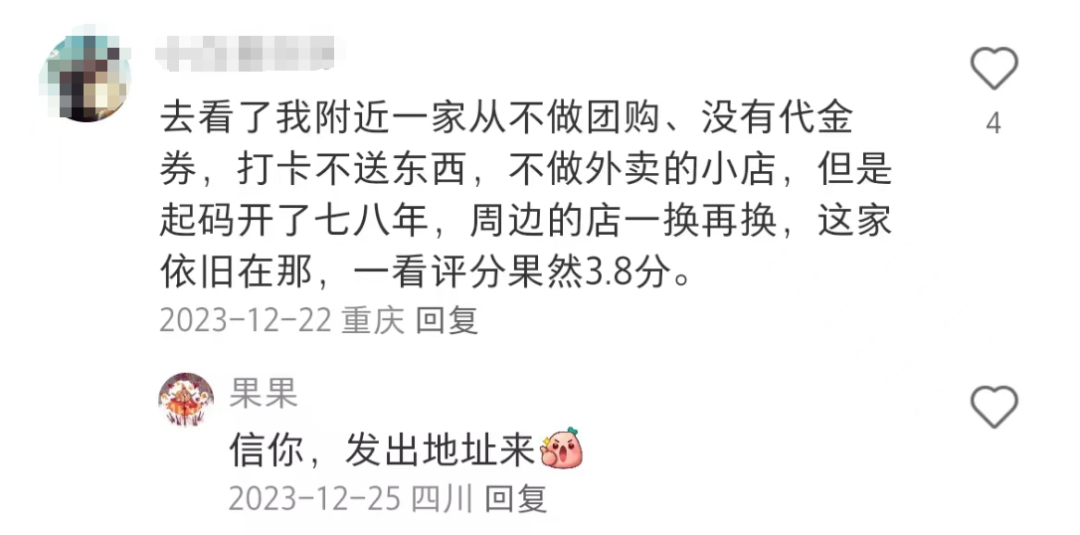 “去看了我附近一家從不做團(tuán)購(gòu)、沒有代金券,打卡不送東西,不做外賣的小店,但是人家起碼開了7、8年,周邊的店一換再換,這家依舊在那,一看評(píng)分果然3.8分!