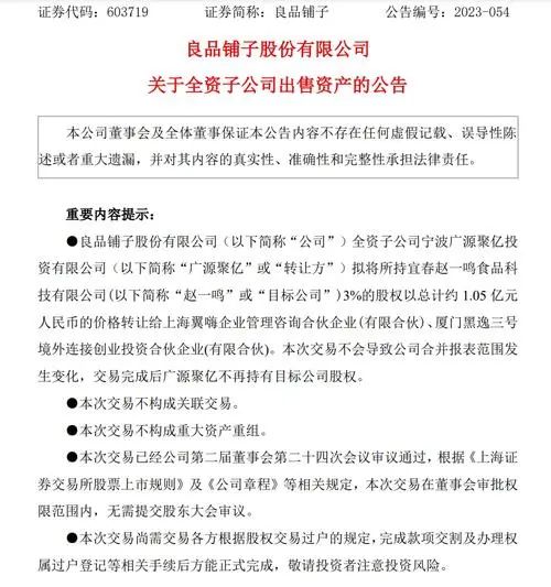 緊接著2023年10月,良品鋪?zhàn)颖阈紝⑺众w一鳴零食3%股權(quán)悉數(shù)轉(zhuǎn)讓,退出對趙一鳴零食的投資。