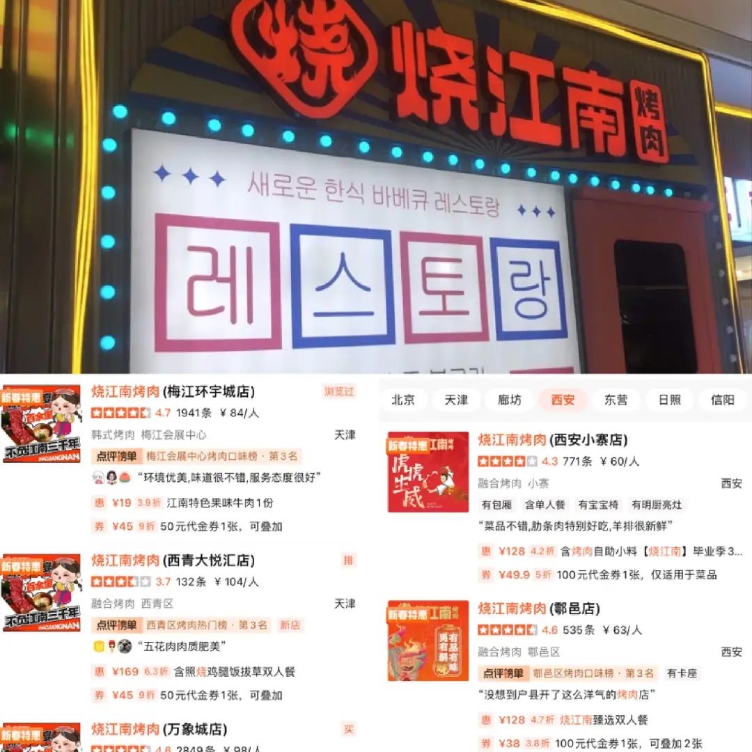 大眾點(diǎn)評(píng)上,搜索“燒江南烤肉”,顯示門(mén)店集中位于天津(6家店)、蘇州、太原(分別有3家店)、西安2家店,以及廊坊、南京、鹽城等各一家店。