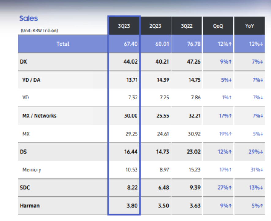 以細(xì)分業(yè)務(wù)來(lái)看,包含智能手機(jī)、智能電視等硬件設(shè)備銷售的DX(設(shè)備體驗(yàn))業(yè)務(wù)在2023年第三季度同比下降了7%。事實(shí)上,2023年三星每個(gè)季度的營(yíng)收都在同比下降,第一、第二季度也分別下降了18%和22%。