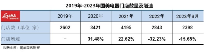 2023年上半年度財報顯示,國美零售2023年上半年的營業(yè)收入僅有4.15億元。門店數(shù)目從2843家減少至2398家,關(guān)閉445家,下降了15.65%。