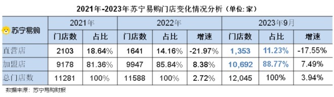 輕資產(chǎn)模式并未能幫助蘇寧易購紓困。根據(jù)2023年三季度報告,蘇寧易購總店數(shù)12045家(見下表),其中,直營店1353家,占比11.23%;加盟店10692家,占比88.77%。這說明蘇寧易購已經(jīng)轉(zhuǎn)向輕資產(chǎn)模式。2023年前三季度的業(yè)務(wù)經(jīng)營相關(guān)利潤凈虧損6.77億元,同比減虧76.57%。輕資產(chǎn)模式在降本增效,但影響有限。