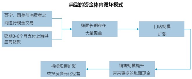 2000年以后,他們憑借當(dāng)時新興的商業(yè)模式家電零售連鎖模式崛起。品牌家電產(chǎn)品以出廠價銷售,他們主要靠“返利+賬期+進場費”來獲利。其中,賬期為他們的迅速擴張?zhí)峁┝吮U,因此形成了如下的資金在體內(nèi)循環(huán)的典型模式(見下圖)