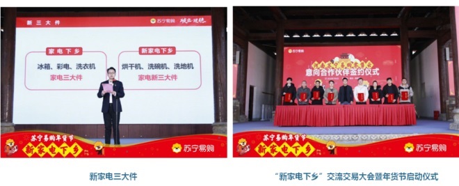 第三件事情,蘇寧易購抓住下沉市場消費者的價格敏感屬性,推出“新家電下鄉(xiāng)”活動,鞏固消費者對于品牌的忠誠度。2024年1月6日,蘇寧易購在河南登封主會場,北京、成都、石家莊分會場,開展“新家電下鄉(xiāng)”交流交易大會暨年貨節(jié)啟動儀式(見下圖),發(fā)布2024新家電下鄉(xiāng)計劃。