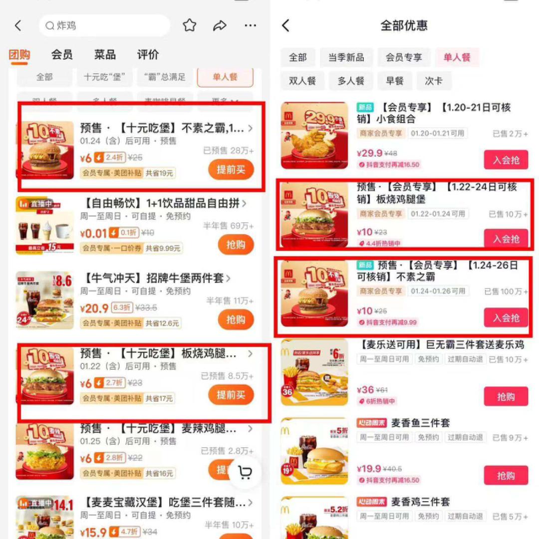 圖/麥當勞單人餐在美團和抖音的售價對比,來源/美團截圖(左)、抖音截圖(右)