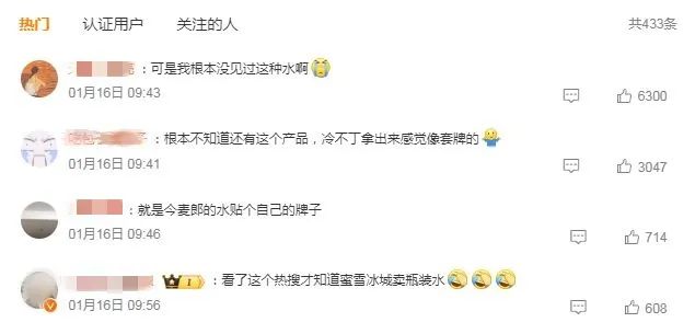 最能說明上述問題的是,在“蜜雪冰城回應(yīng)放棄瓶裝水業(yè)務(wù)”話題留言區(qū),“可是我根本沒見過這種水”“根本不知道還有這個產(chǎn)品”“看了熱搜才知道蜜雪冰城賣瓶裝水”等都是高贊留言。