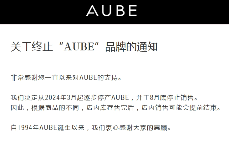 近日,花王旗下彩妝品牌AUBE在官網(wǎng)發(fā)布公告,宣布決定從2024年3月起逐步停產(chǎn)AUBE,并于8月底停止銷(xiāo)售。因此,根據(jù)商品的不同,店內(nèi)庫(kù)存售完后,店內(nèi)銷(xiāo)售可能會(huì)提前結(jié)束。