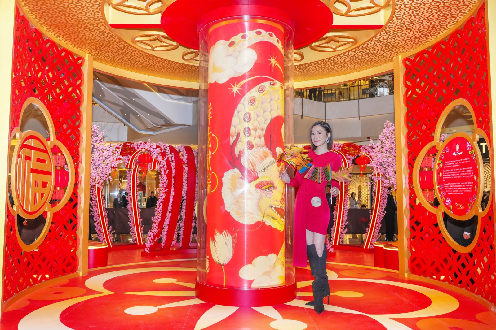 這次“龍騰飛躍耀新春”裝置有三大打卡點:一座高達五米“福運豐財聚寶盒”巨型藝術(shù)裝置矗立于商場中庭,龍年寶盒驚喜開啟,寓意著福氣集聚、鴻運齊開;兩面圍繞著巨型福字屏風和四周懸掛的大紅燈籠寓意著四方來財,八方聚福。聚寶盒內(nèi)朵朵繁花綻放與聚寶盒外的桃花樹遙相呼應(yīng),桃花樹下更有中國傳統(tǒng)卷軸及好運簽筒,預示著福運備至,呈現(xiàn)一派祥和喜慶、熱鬧非凡的景象。閃耀奪目的“鴻運飛龍跑馬燈”位于藝術(shù)裝置正中央,插畫藝術(shù)家以傳統(tǒng)生肖“龍”形象為創(chuàng)作主題,飛龍蜿蜒盤旋于動感跑馬燈上,不停旋轉(zhuǎn)的燈柱象征貨如輪轉(zhuǎn),財運源源不斷。