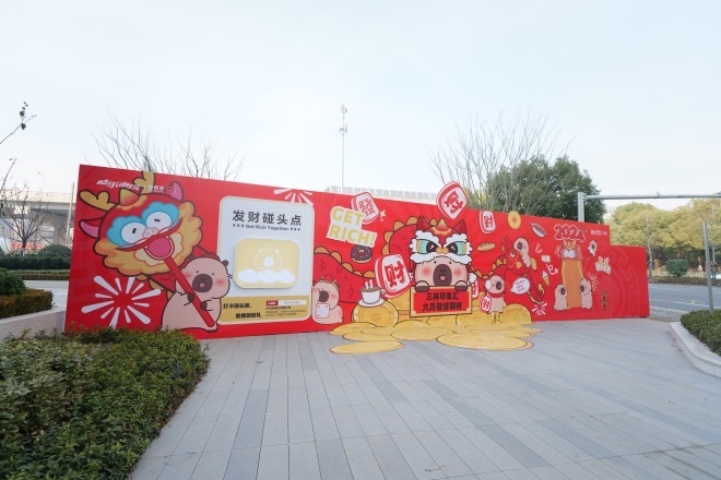 長(zhǎng)達(dá)15米的“卡皮巴拉”創(chuàng)意互動(dòng)圍擋同樣成為了一道亮麗的風(fēng)景線,吸引了眾多市民的目光。滿載金幣的聚寶盆、寓意財(cái)運(yùn)的麻將牌,開(kāi)啟一整年的好運(yùn)!翱ㄆぐ屠币泊魃狭诵履甓ㄖ频凝堫^帽,傳遞浦發(fā)三林印象匯對(duì)顧客的美好祝福。
