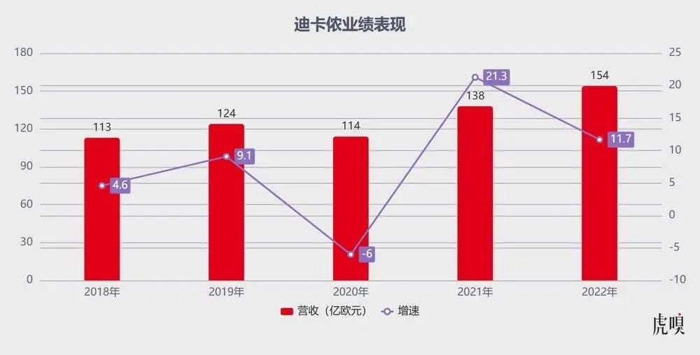經(jīng)營業(yè)績上的表現(xiàn)更加明顯。2020到2022年,迪卡儂營收從114億歐元增長到了154億歐元。單年度看,其2021年和2022年的營收增速,都超過此前十年的水平。