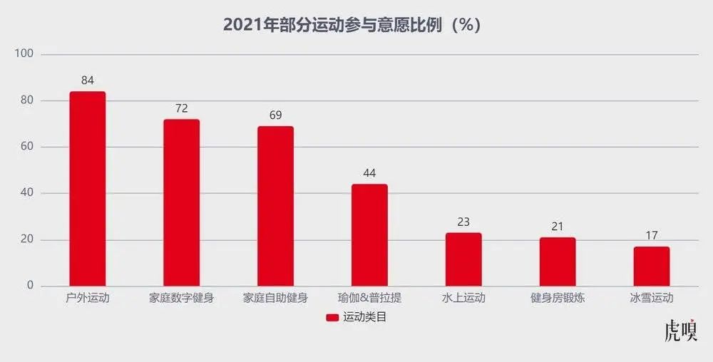 迪卡儂能火起來,自然得益于戶外運動的爆發(fā)。2021年開始,滑雪、露營、騎行等層出不窮的戶外運動開始冒頭,從小眾人的愛好變成了社會潮流。當(dāng)年,麥肯錫調(diào)研發(fā)現(xiàn),戶外運動參與意愿比例達(dá)到84%,在一眾運動中遙遙領(lǐng)先。