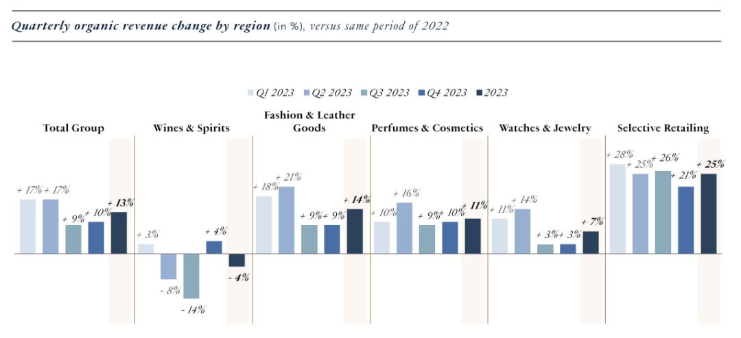 至此,2023年LVMH全年僅有三季度營收遜于預(yù)期,一季度和二季度的營收均增長17%,三季度9%的增速幾乎只有前兩個(gè)季度的一半。
