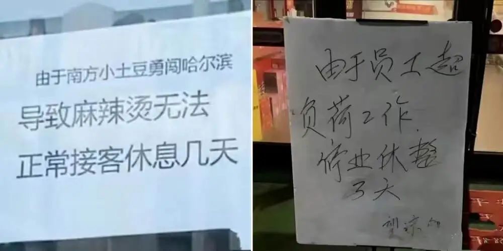 前幾天,哈爾濱一家麻辣燙店高掛“免戰(zhàn)牌”,申請休假,這一幕似曾相識,這不由得讓內(nèi)參君想到去年淄博的某一燒烤店因員工超負荷工作而貼出停業(yè)三天的告示。