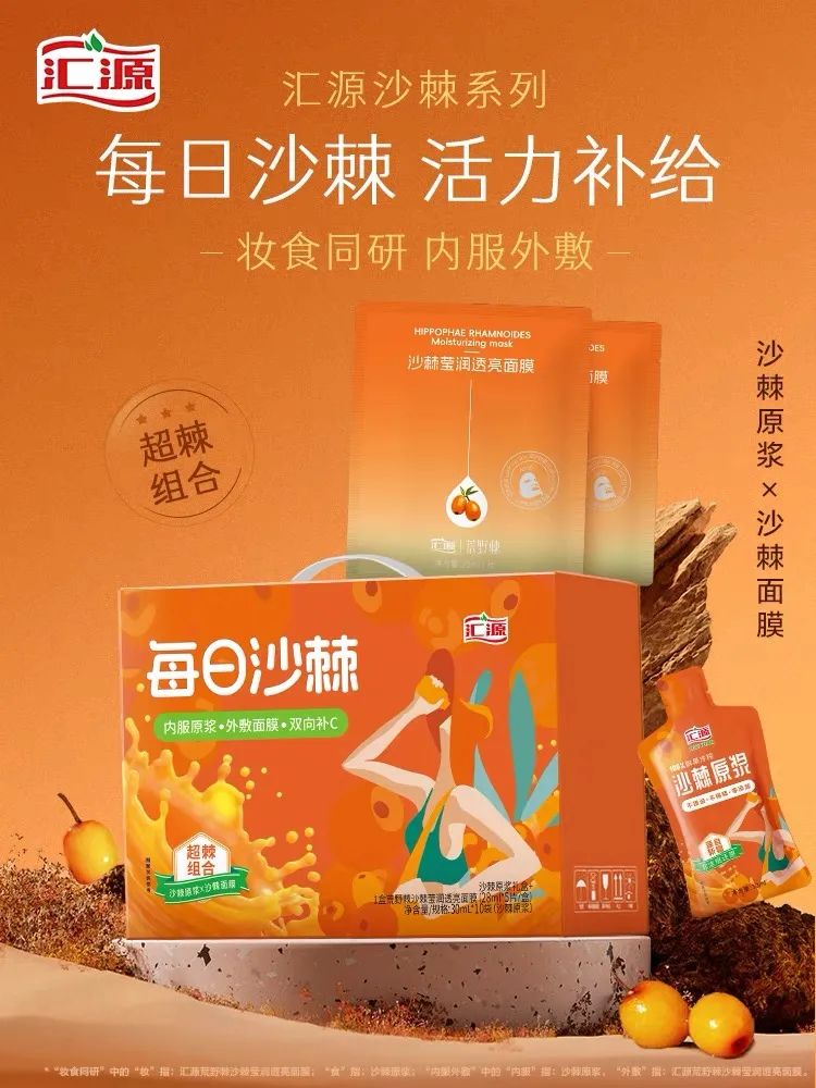 匯源用一款面膜殺入了美妝日化領(lǐng)域。前陣子,匯源推出“每日沙棘禮盒”,禮盒包括10袋沙棘原漿果汁和5片“沙棘瑩潤透亮面膜”,售價(jià)79元起。若單買面膜,價(jià)格為69.5元/5片。