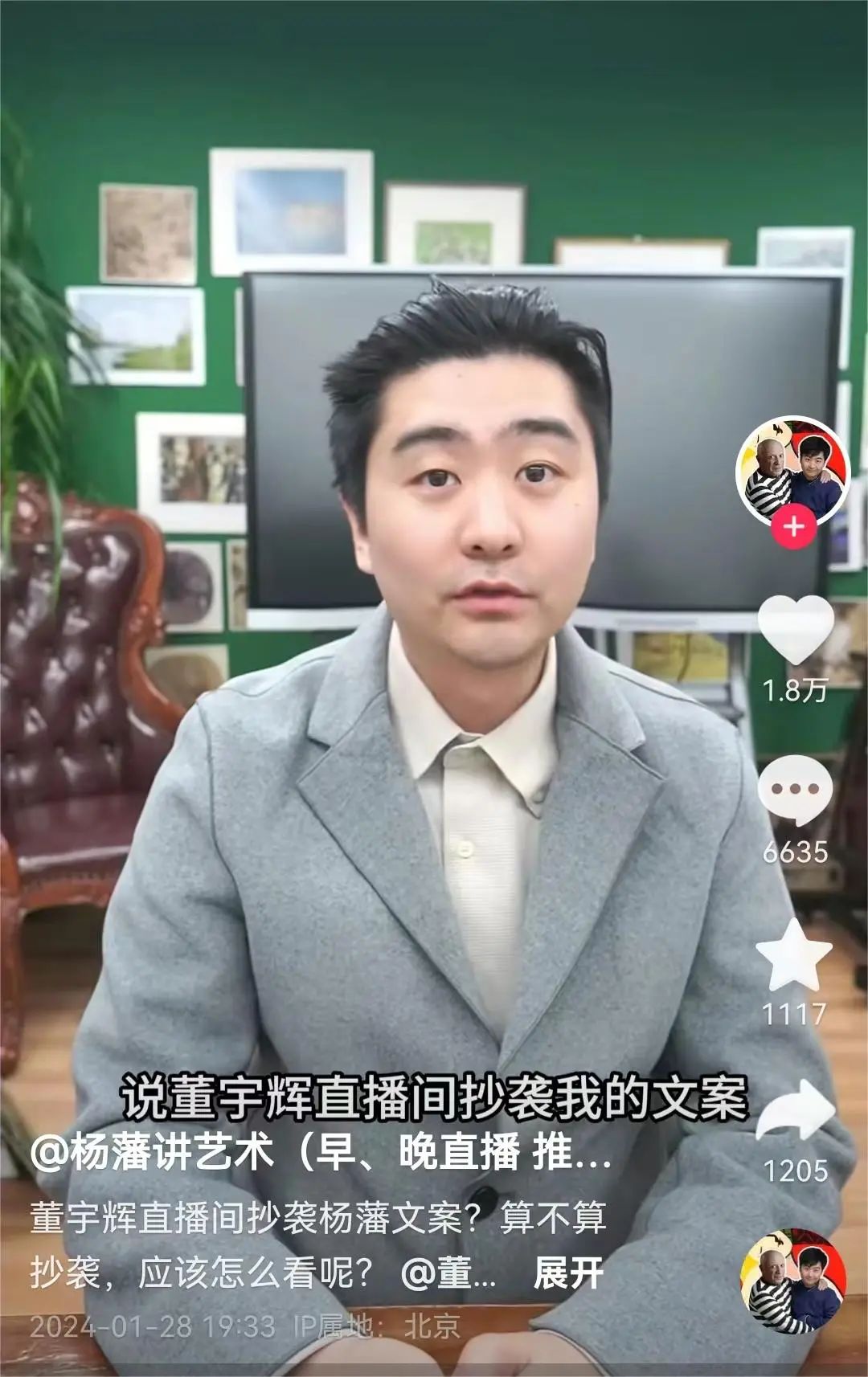 近日,百萬(wàn)粉絲博主“楊藩講藝術(shù)”在抖音平臺(tái)發(fā)布兩條視頻,聲稱與輝同行直播間抄襲自己的文案。在抖音,楊藩講藝術(shù)擁有235萬(wàn)粉絲。