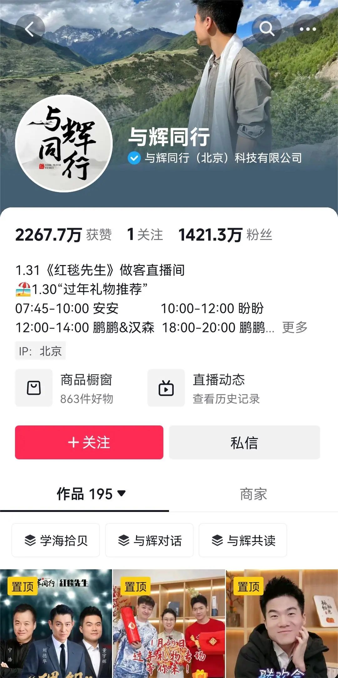 與輝同行抖音賬號(hào)自2023年12月26日注冊(cè)后,截至目前,已經(jīng)擁有1421.3萬(wàn)粉絲,粉絲增長(zhǎng)速度驚人,董宇輝的號(hào)召力和影響力可見(jiàn)一斑。