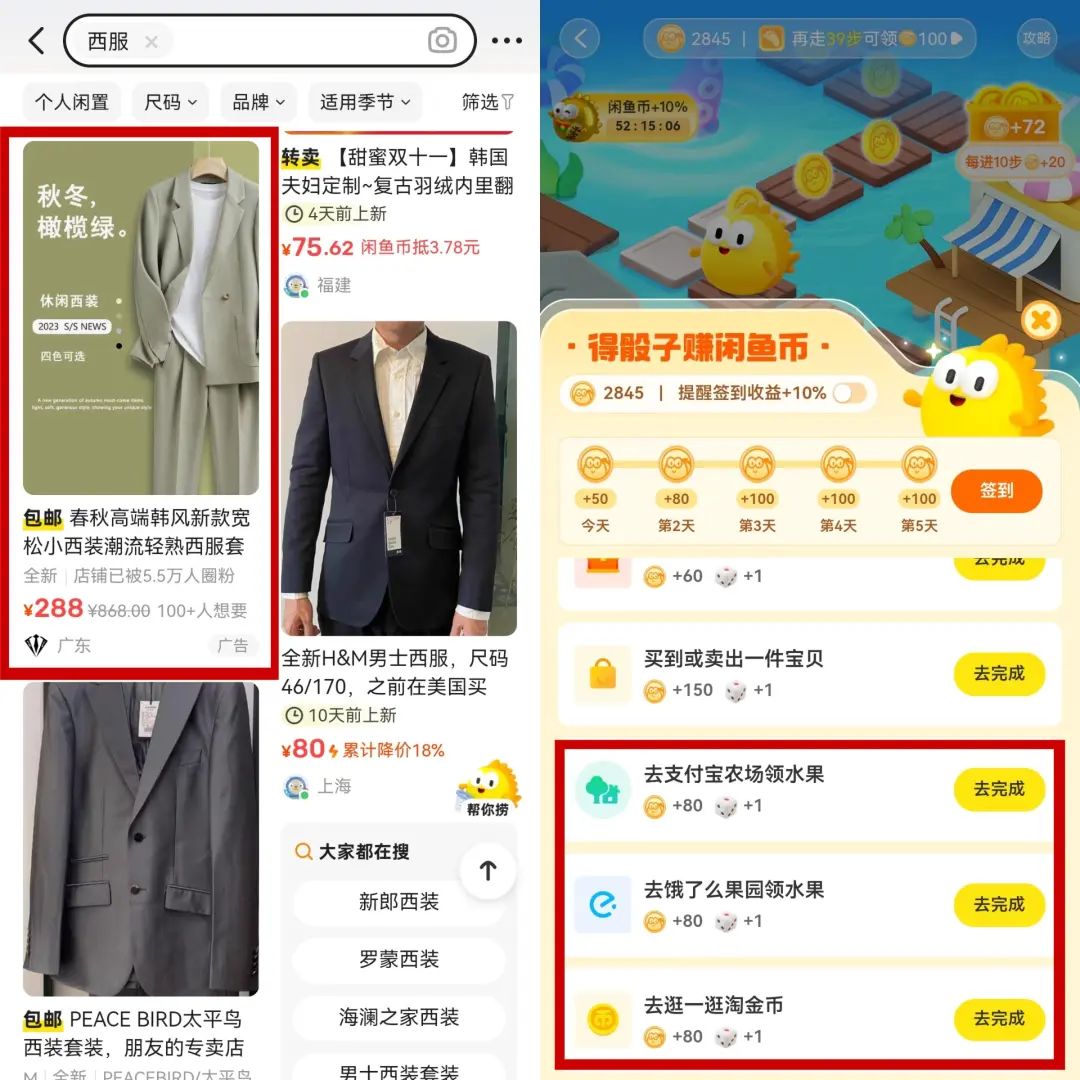 閑魚的增長,可以為淘寶、天貓和菜鳥等產(chǎn)品導流。在閑魚搜索寶貝時,會出現(xiàn)部分來自淘寶、天貓平臺的商品,閑魚幣的機制,也在將閑魚的流量導向阿里其他平臺。
