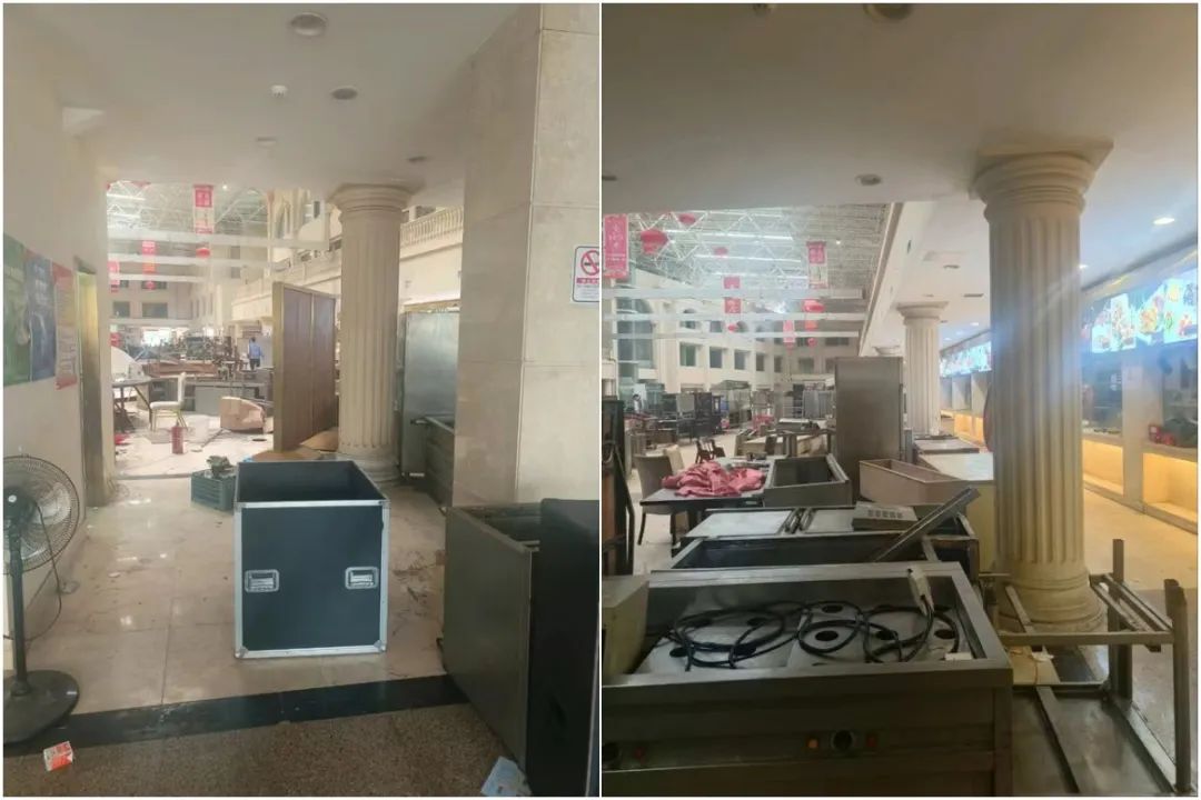 走進(jìn)店內(nèi),原本寬敞氣派的宴會大廳,如今只剩下四處零散在地、等待打包的各種物品。