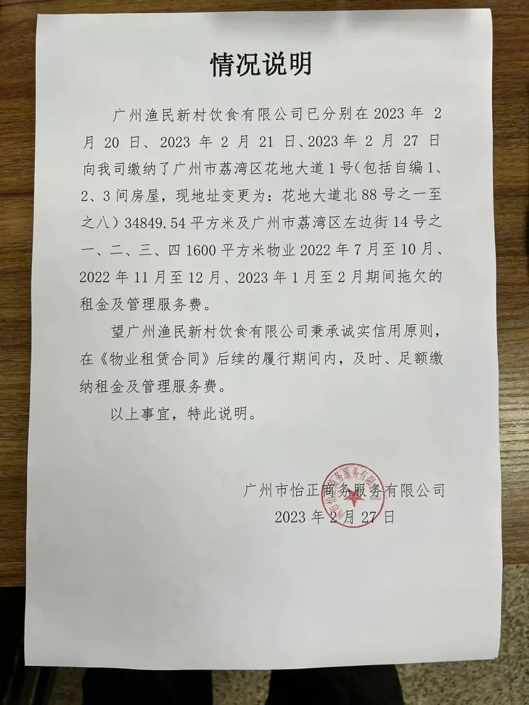 2023年2月,怡正公司曾發(fā)布通知稱,漁民新村芳村店拖欠其2022年7月-2023年2月的租金和管理費(fèi),合計(jì)款項(xiàng)1095.52萬元,如芳村店未能按期繳納,怡正公司將收回物業(yè)。