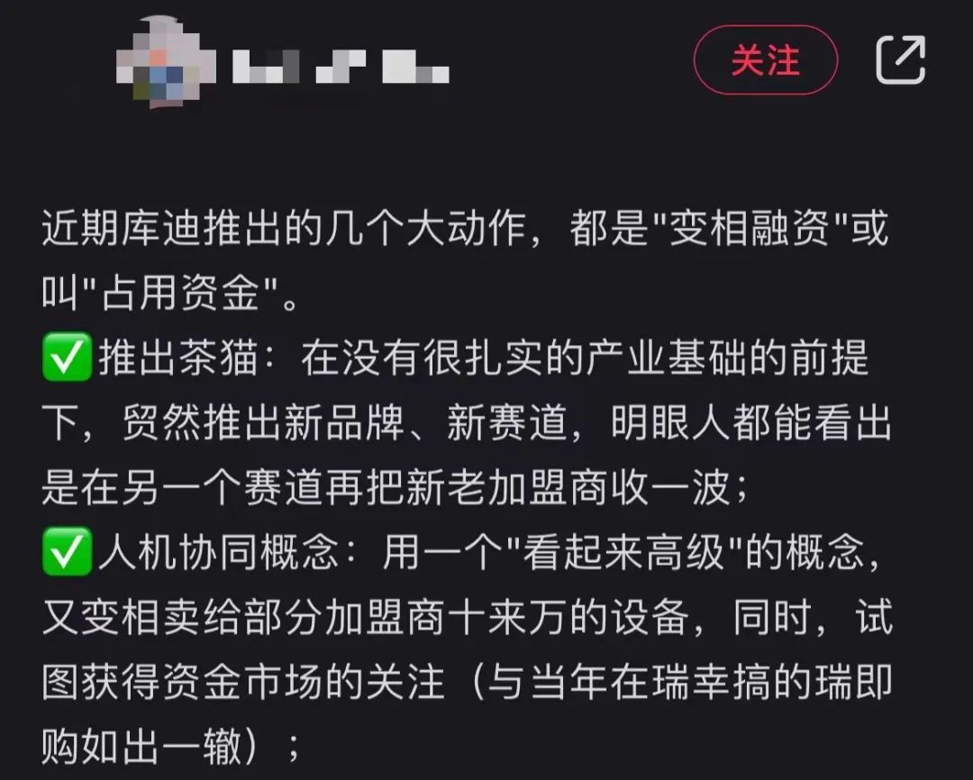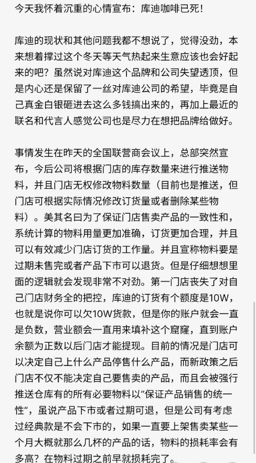此消息一出,立刻激起了諸多不滿,一位聯(lián)營商在社交媒體平臺直接指出“門店喪失了對財務(wù)權(quán)的把控”“物料的損耗率難以估計”“以解約威脅聯(lián)營商訂酒”等問題,最后更是沉痛的表示“庫迪咖啡已死”。