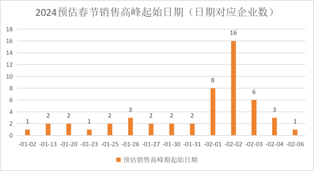 今年除夕日為工作日,大部分地區(qū)預(yù)估從2月1日-3日開(kāi)始進(jìn)入銷售高峰。