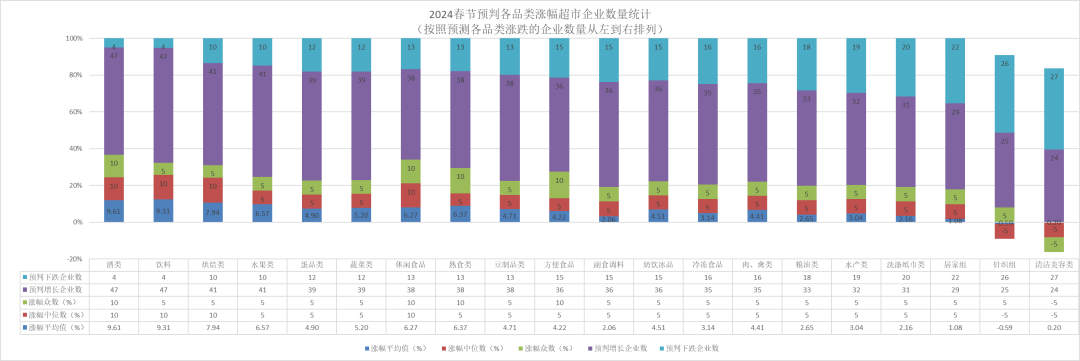 新春佳節(jié)即將來(lái)臨,中國(guó)連鎖經(jīng)營(yíng)協(xié)會(huì)采購(gòu)專業(yè)委員會(huì)開(kāi)展了2024年春期間各商品品類的銷售預(yù)測(cè)調(diào)查。51家商超企業(yè)參與了調(diào)查,通過(guò)對(duì)比,可以為商超行業(yè)、企業(yè)提供參考,調(diào)查結(jié)果如下: