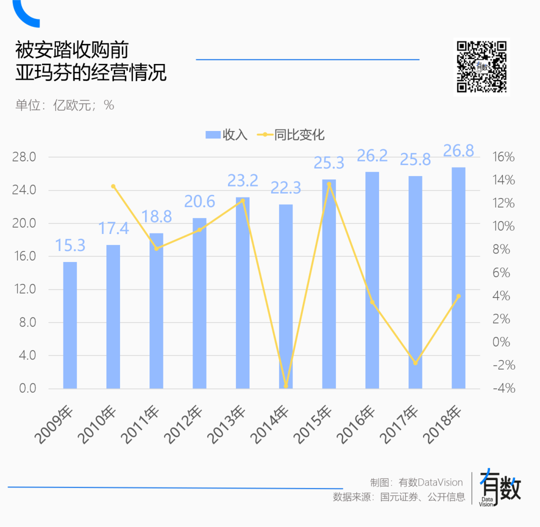原本,在亞瑪芬的想象中,隨著各領(lǐng)域內(nèi)品牌越來越完善,在協(xié)同效應(yīng)的帶動(dòng)下,便能實(shí)現(xiàn)快速增長。現(xiàn)實(shí)卻是殘酷的:收購薩洛蒙后,亞瑪芬收入規(guī)模4年內(nèi)縮水了近2億歐元[5]。
