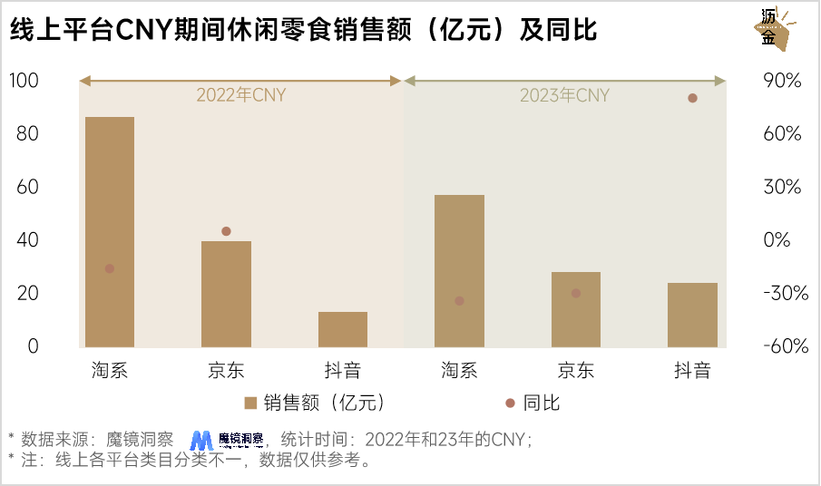 其中,淘系是休閑零食的主戰(zhàn)場,2023年CNY期間銷售額超50億元;抖音增速最快,銷售額同比大漲80.6%。