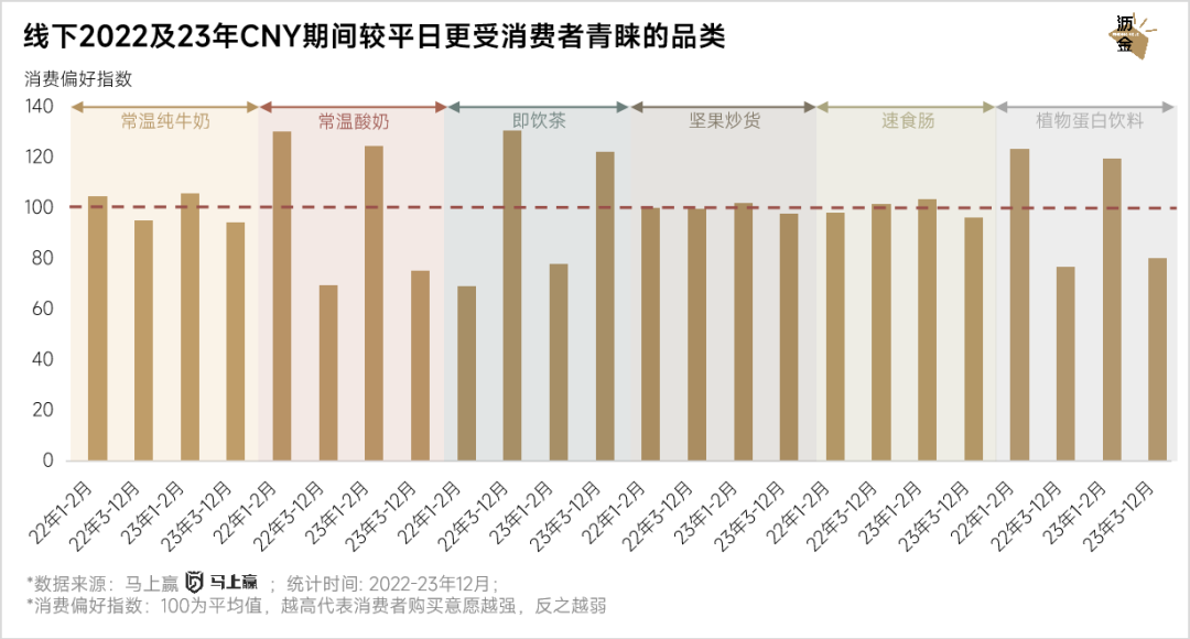 與線上不同的是,CNY期間消費者更傾向于在線下采購常溫奶、常溫酸奶等乳制品和植物蛋白飲料。