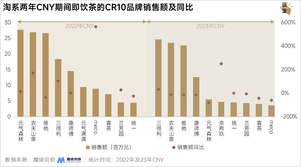 從淘系即飲茶CR10品牌連續(xù)兩年的銷售表現(xiàn)來看,農(nóng)夫山泉、維他的連續(xù)兩年CNY期間都賣了超20億,銷售額波動不大。