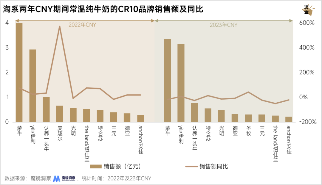 淘系兩年CNY期間常溫純牛奶的CR10品牌銷售額及同比