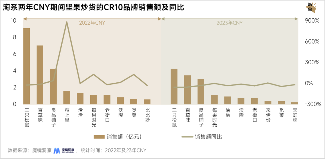 淘系兩年CNY期間堅果炒貨的CR10品牌銷售額及同比