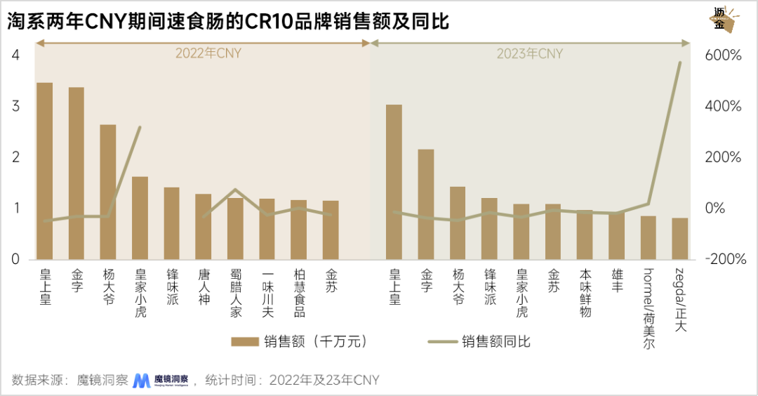 淘系兩年CNY期間速食腸的CR10品牌銷售額及同比