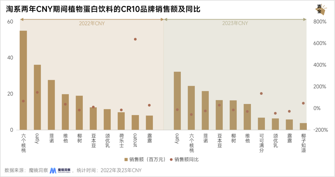 先看線上市場,淘系植物蛋白飲料的品牌CR10格局中,六個核桃、Oatly和菲諾連續(xù)兩年位居前三。