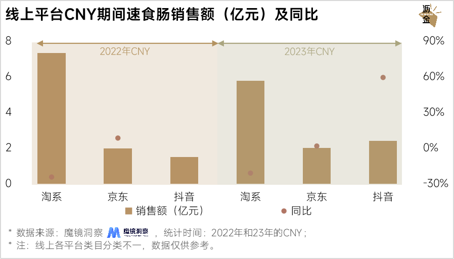 先看線上,CNY期間,速食腸連續(xù)兩年在淘系、京東、抖音賣了10個億,銷售額同比在京東、抖音均有增長。