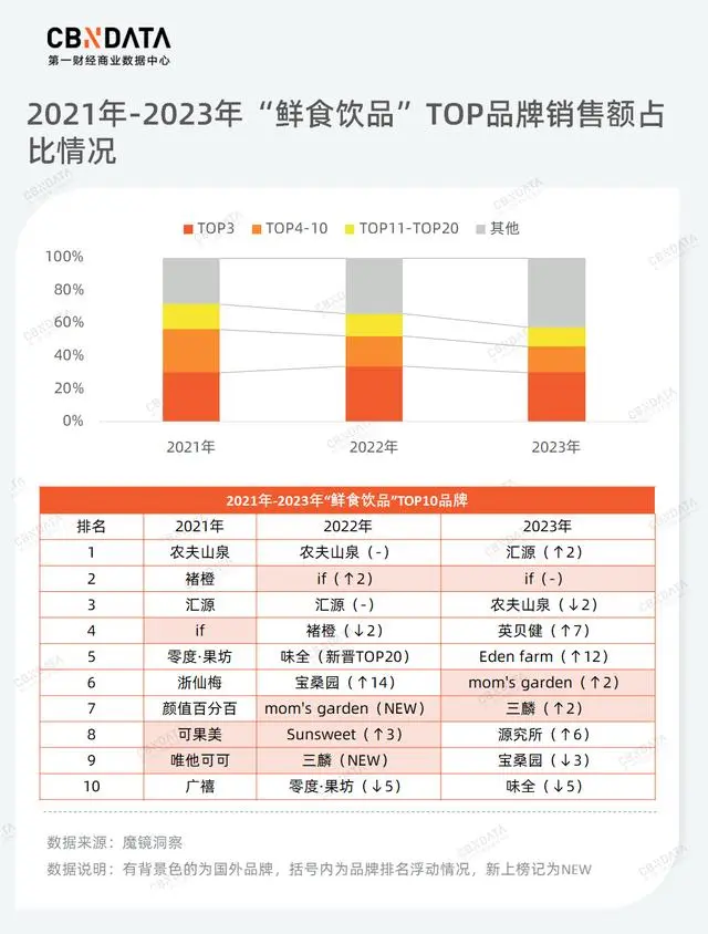 據(jù)第一財經(jīng)商業(yè)數(shù)據(jù)發(fā)布的《2023年消費報告》顯示,鮮食飲品市場份額方面,整體集中度明顯降低,TOP20品牌的市場份額已從2021年的71.8%下降至2023年的57.59%。這意味著市場上有了越來越多的“挑戰(zhàn)者”。