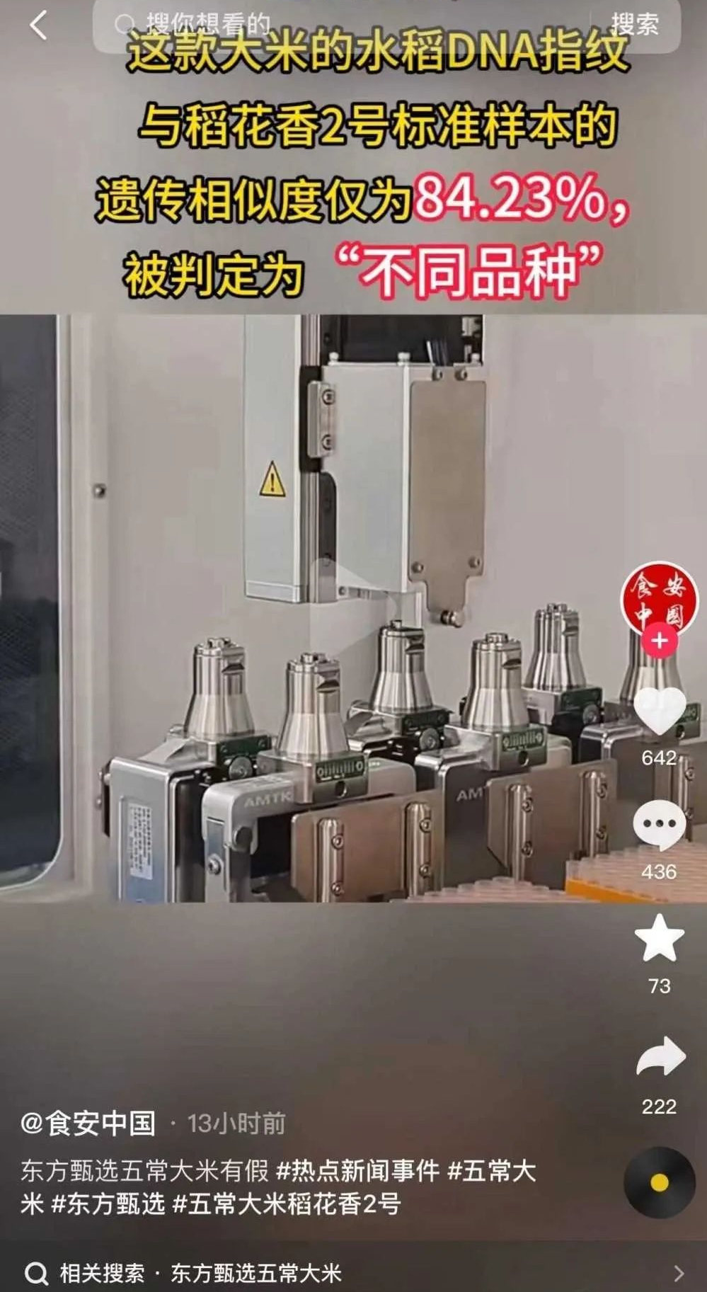 隨后,中國食品安全網(wǎng)也對東方甄選的這款五常大米進(jìn)行了打假。根據(jù)檢測結(jié)果顯示,該款大米的水稻DNA指紋與稻花香2號標(biāo)準(zhǔn)樣本的遺傳相似度僅為84.23%,被判定為“不同品種”。