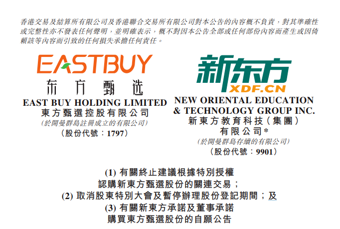 日前,東方甄選及新東方聯(lián)合發(fā)布公告稱,東方甄選董事會及新東方董事會已各自批準(zhǔn)終止認(rèn)購協(xié)議并訂立終止協(xié)議;新東方及俞敏洪各自已承諾以市價在港交所購買合共價值7億港元東方甄選股份。