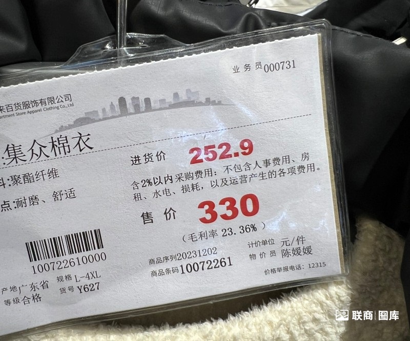 胖東來的大眾服飾商品不僅價(jià)格有整有零,更把進(jìn)貨價(jià)、毛利率寫得清清楚楚,同時價(jià)簽上還會公布產(chǎn)品產(chǎn)地,有些甚至貼有進(jìn)貨商電話,而羽絨服、棉衣正常情況下毛利率一般為23%-28%不等。