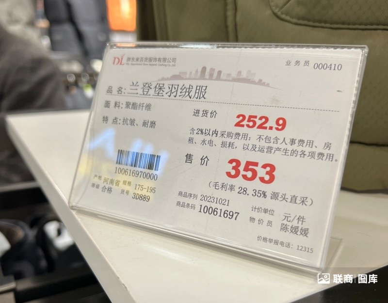 網(wǎng)友發(fā)布的圖片顯示,該羽絨服上掛著一個黃色牌子,上面明確標(biāo)注了進(jìn)貨價(jià)為498.7元,售價(jià)499元。在進(jìn)貨價(jià)下方有一行小字說明,包含2%以內(nèi)的采購費(fèi)用,但不包括人事費(fèi)用、房租、水電、損耗以及運(yùn)營產(chǎn)生的各項(xiàng)費(fèi)用;在售價(jià)下方,則標(biāo)注了毛利率僅為0.06%,并注明該羽絨服為源頭直采;價(jià)格標(biāo)簽的右下方,還有“新鄉(xiāng)市市場監(jiān)督管理局監(jiān)制”字樣。