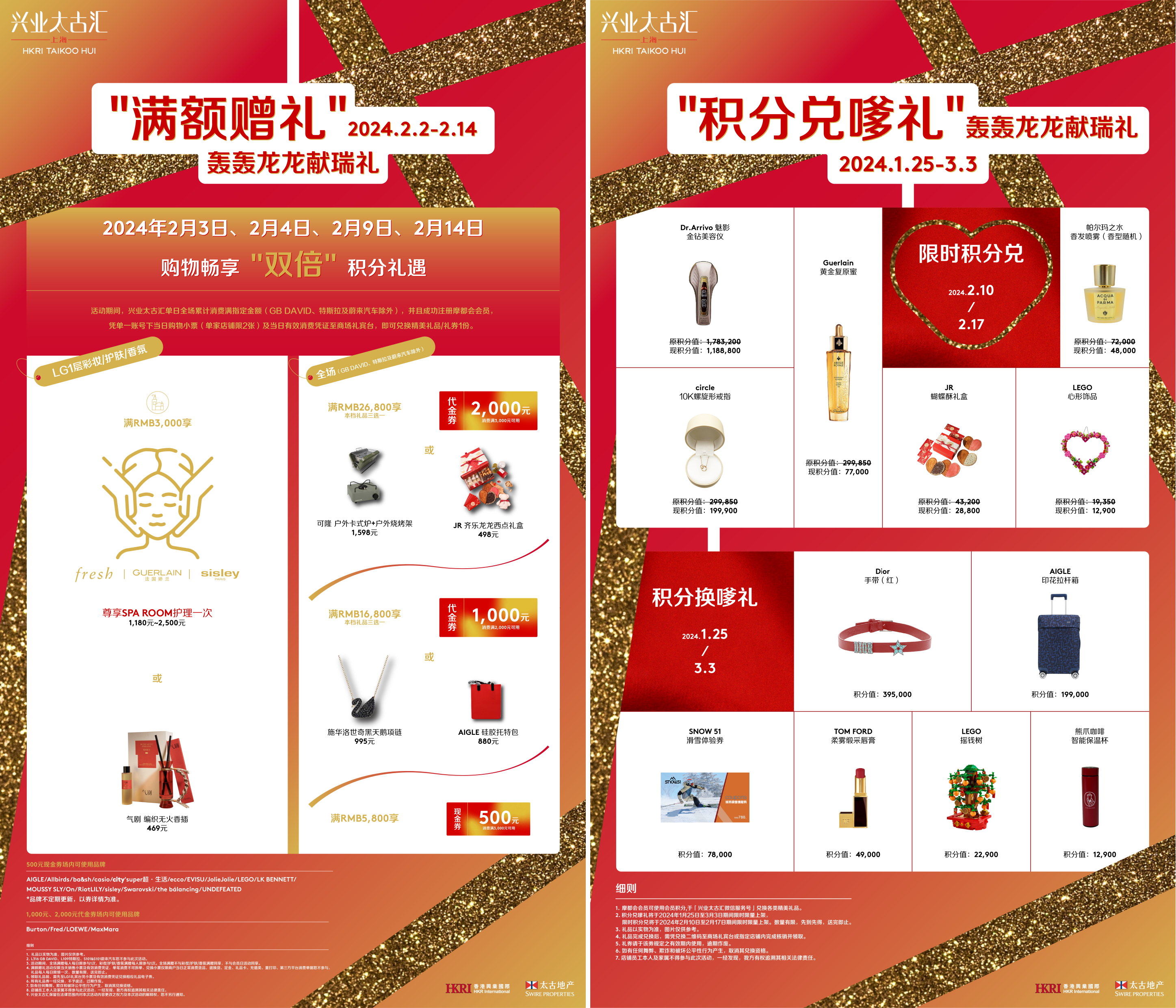 禮遇派送不止如此,興業(yè)太古匯 “轟轟龍龍獻瑞禮”新春促銷攜豐厚新年福利為假日消費加碼,F金禮券、滿額贈禮、積分翻倍等一系列促銷活動不間斷上演,消費者最高可享價值約3000元的禮品,為新春假期加滿活力。