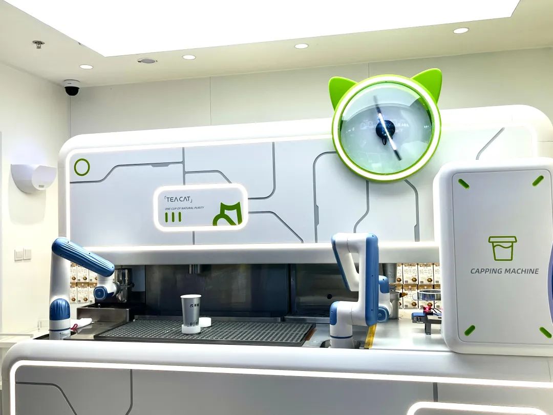 作為庫迪的第二品牌,茶貓的創(chuàng)新點(diǎn)還包括商業(yè)機(jī)器人的應(yīng)用。品牌稱,所有茶貓門店都將配備人機(jī)協(xié)作系統(tǒng),通過配料機(jī)器人、制作機(jī)器人和送餐機(jī)器人,完成飲品的制作。