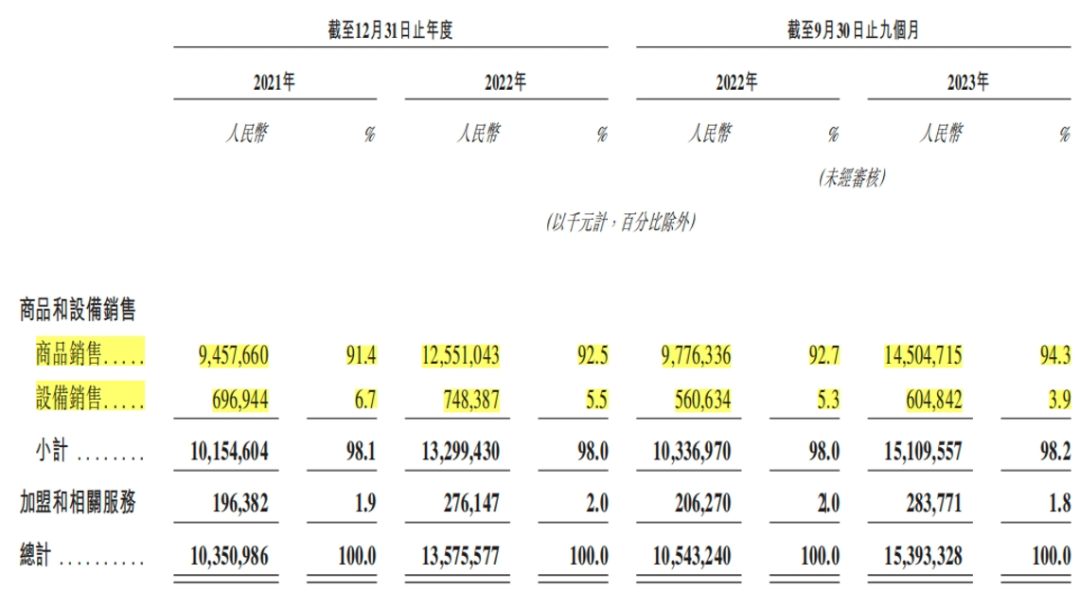 招股書數(shù)據(jù)提到,2023年前三季度,蜜雪冰城營收為153.93億元,其中商品銷售收入占比94.3%,賣產(chǎn)品收入為145億元左右。